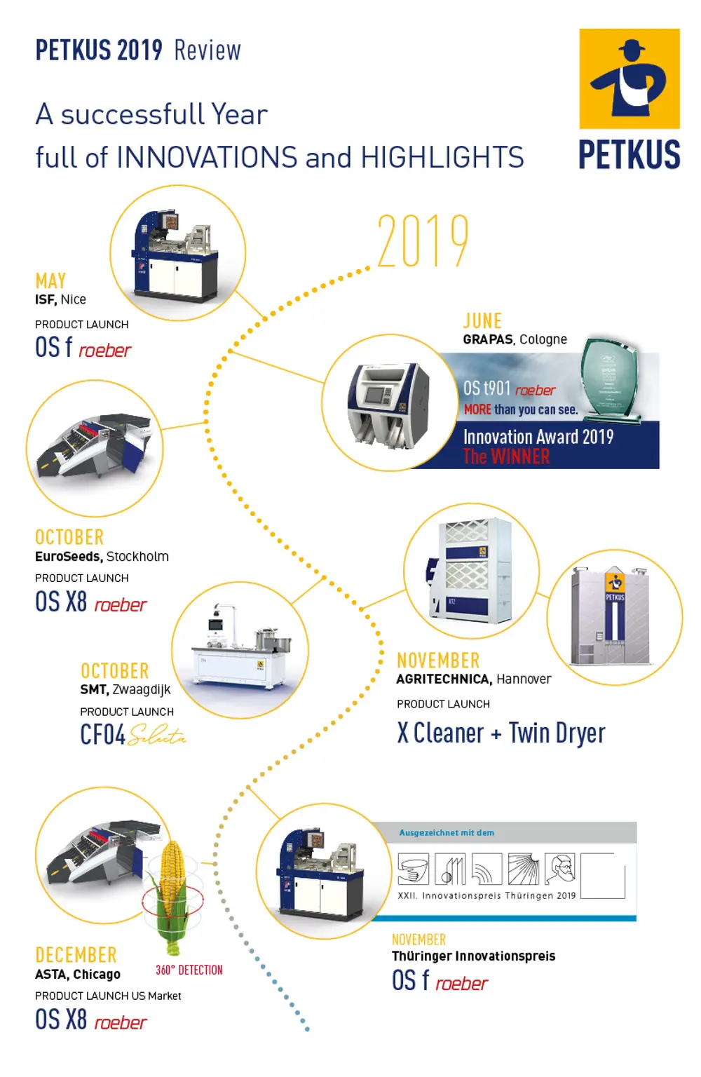 PETKUS genießt international eine hervorragende Markenbekanntheit. Das vergangene Jahr war reich an Innovationen. Im Jahr 2019 wurden zahlreiche neue Produkte vom Prototypen in die Serienfertigung in unserem Werk im thüringischen Wutha-Farnroda überführt. Drei neue optische Sortiermaschinen wurden in den Markt eingeführt: der OS f roeber für die optische Sortierung von Feinsämereien, der OS t, der mit seiner Transmissionstechnologie viele Vorteile für die verarbeitende Industrie bietet, und der Maiskolbensortierer OS X mit 360°-Erkennung. Die Beiztechnik wurde mit dem Trommelbeizer CD weiter vervollständigt. Für die leistungsstarke Reinigung steht nun der X-Reiniger zur Verfügung.